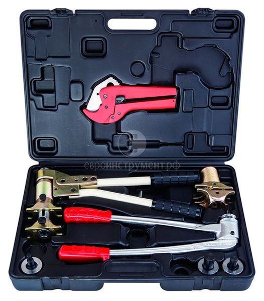 Комплект ручного инструмента для монтажа надвижных фитингов трубопроводов из сшитого полиэтилена диаметром от 16 до 32 мм.