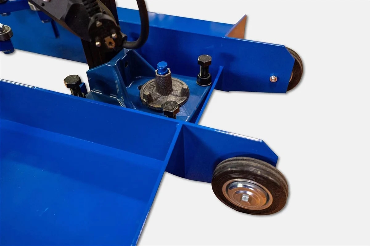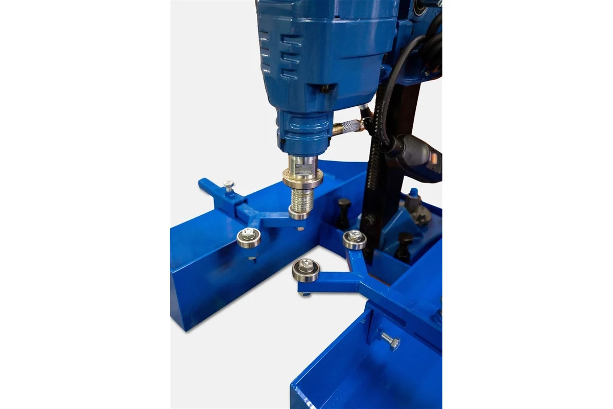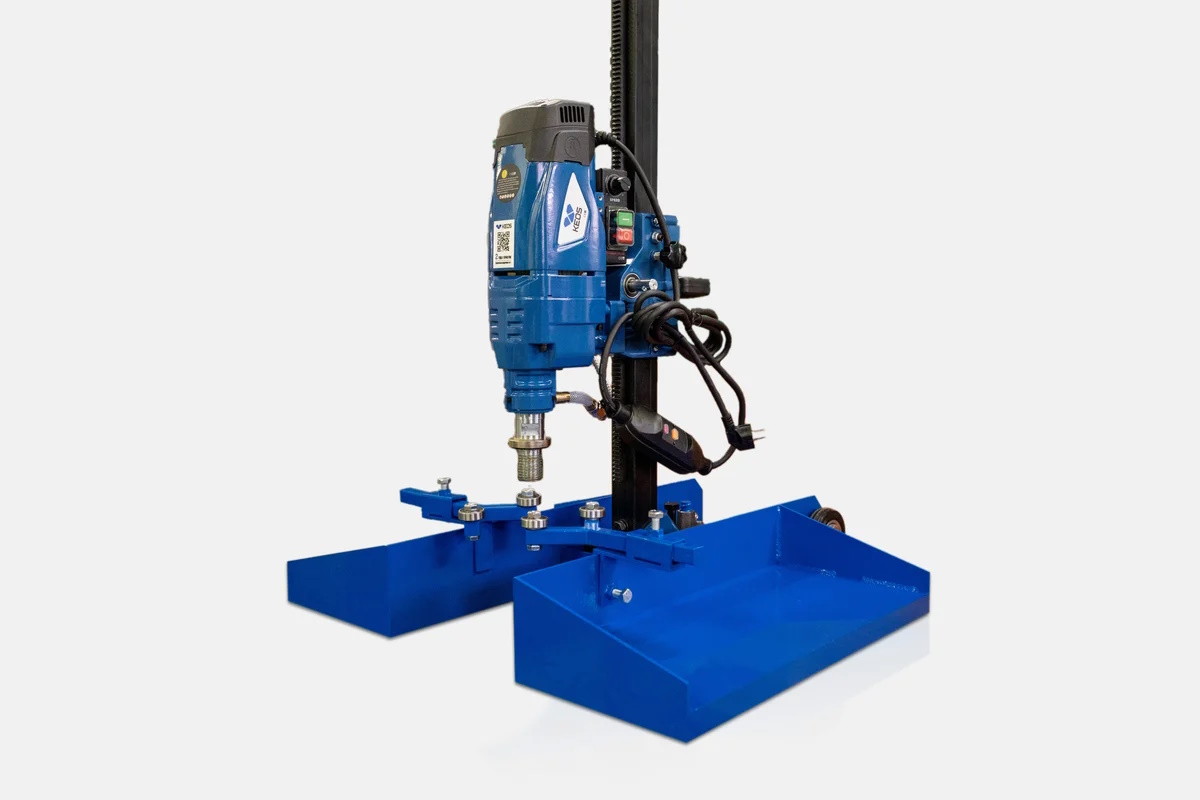 Максимальный диаметр сверления 250 мм. Двойная посадка шпинделя ½ и 1¼ дюйма позволяет работать разными коронками, без использования лишних переходников. К станине крепится опорная плита для большей устойчивости. Оператор становится на платформу и удерживает своим весом станину с мотором в устойчивом положении даже при высокой нагрузке. Вес оборудования 45 кг.