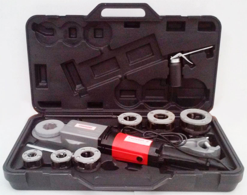 Электрический резьбонарезной клупп для труб диаметром 1/4 - 2'' в кейсе с головками BSPT R 1/2-3/4-1-1.1/4-1.1/2-2". Предназначен для быстрого и легкого изготовления точных и надежных резьбовых соединений.