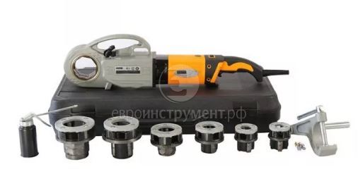 Электрический резьбонарезной клупп для труб диаметром 1/4 - 2'' в кейсе с головками BSPT R 1/2-3/4-1-1.1/4-1.1/2-2". Предназначен для быстрого и легкого изготовления точных и надежных резьбовых соединений.