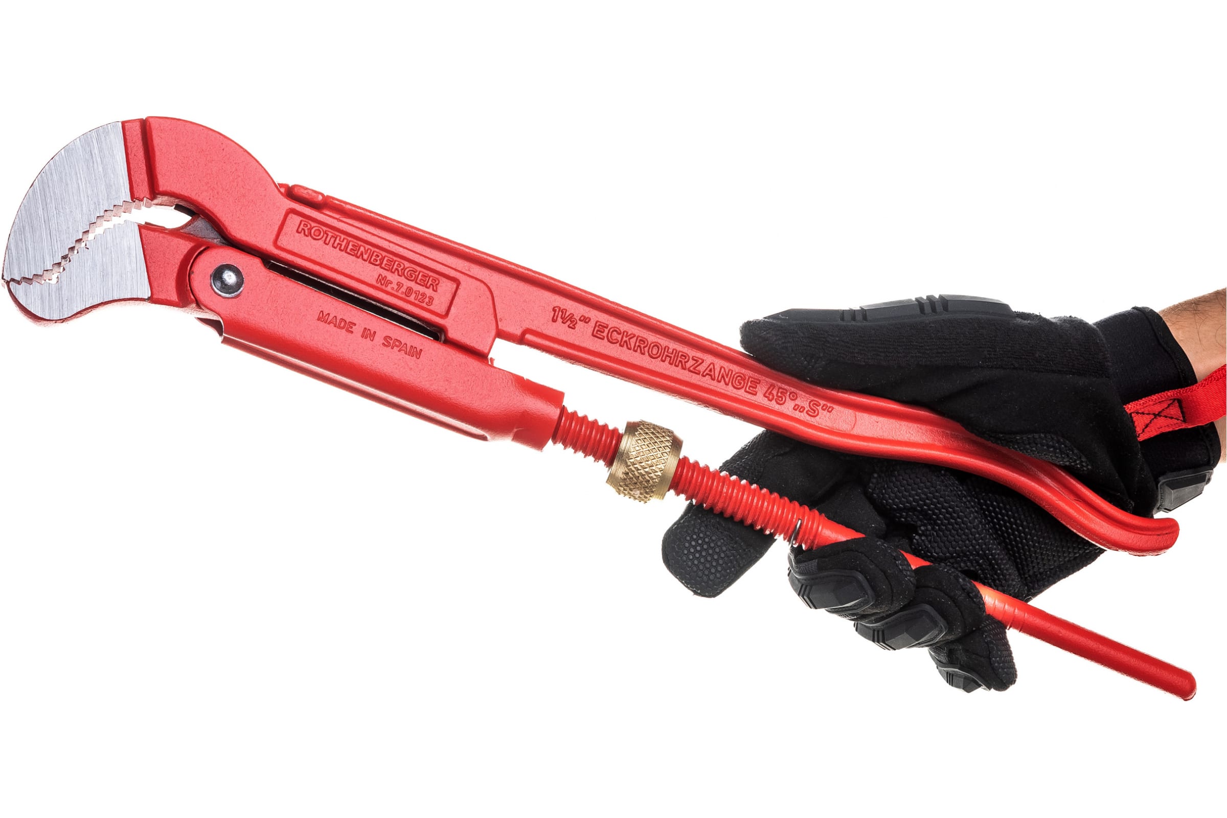 Газовый ключ Rothenberger 90° из хромванадиевой стали, ковано-штампованный, с усиленной гильзой, шлифованные губки, узкий зев, удобный угловой размер.