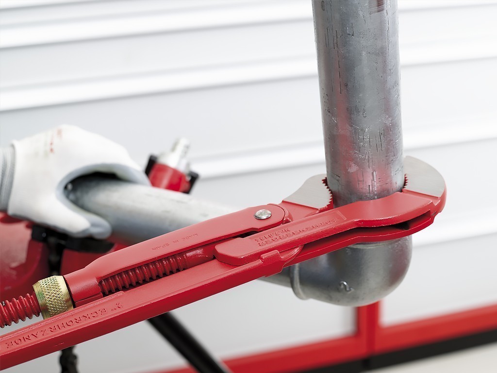 Газовый ключ Rothenberger 90° из хромванадиевой стали, ковано-штампованный, с усиленной гильзой, шлифованные губки, узкий зев, удобный угловой размер.