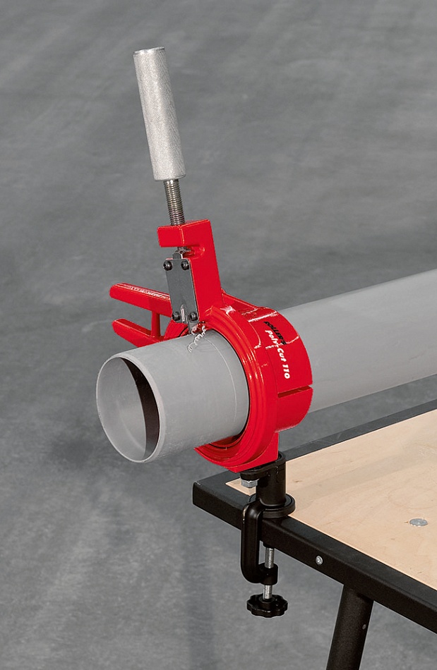 Универсальный инструмент для абсолютно точной перпендикулярной резки и снятия фаски под углом 15° тонкостенных и толстостенных пластмассовых труб из ПВХ, ПЭ, ПП, PE-X, ПБ и ПВДФ, а также звукоизоляционных труб Ø 32–110 мм. В комплекте с вкладышами 50, 63, 75 и 90мм, а также со струбциной для крепления к верстаку.