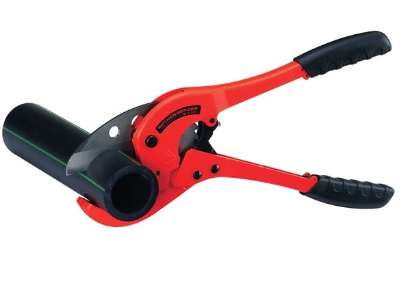 Режущий инструмент идеально подходит для работы одной рукой и способен отрезать РЕ-Х, ПЭ, ПБ, ПП и ПВДФ трубы.