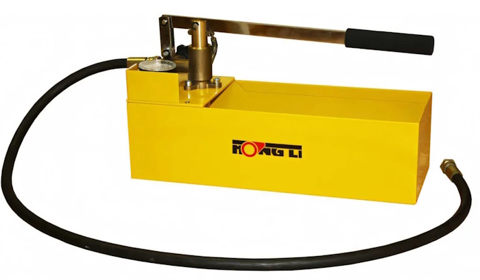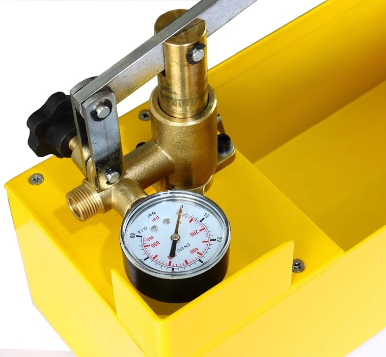 Резервуар опрессовщика изготовлен из стали и покрыт антикоррозионной краской. Устройство работает с максимальным давлением 60 бар. Длинный рычаг с удобной рукояткой облегчает работу и может быть зафиксирован и использован как ручка для переноски.