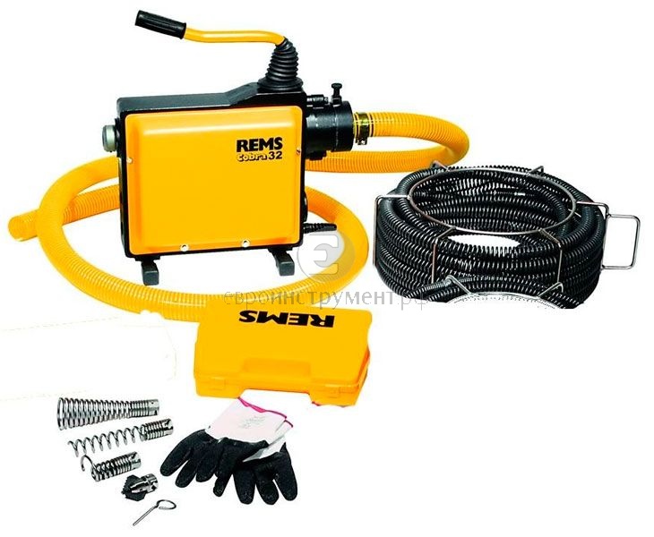 REMS Кобра 32 – электрическая машина для прочистки трубопроводов до Ø250мм в комплекте с 6 частями спиралей Ø32мм х 4,5м. Очень эффективное устройство, позволяющее быстро и просто устранить засор. Система зажимов, находящаяся вне корпуса машины,а также сквозной закрытый рабочий шпиндель предотвращают загрязнение двигателя и привода, воздействие на них воды.