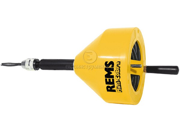 REMS Мини-Кобрa – надежное, легкое и удобное прочистное устройство барабанного типа, применяемое со спиралями ∅6, 8 и 10мм для труб диаметром до 50мм. Включает возможность работать вручную или при помощи электрического привода. Удобен при работе с небольшими засорами.