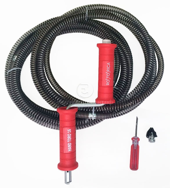 Ручное устройство для прочистки труб Rotorica HAND TORO 16 RT.1521692 подойдет для прочистки труб диаметром до 100 мм. Инструмент приводится в действие при помощи приводной рукоятки, идущей в комплекте. Трос имеет диаметр 16 мм и длину 9.2 м.