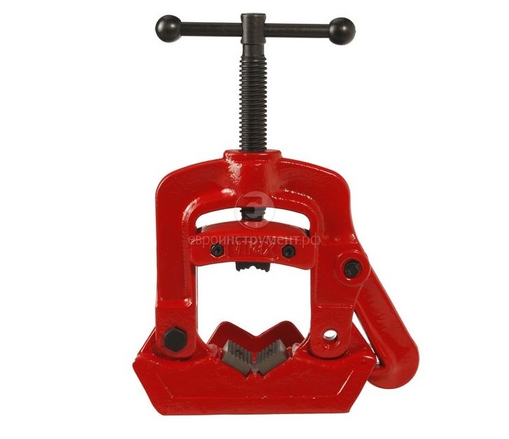 Болт с трапециевидной резьбой. Стальные кованые тиски. Специальная раскрывающаяся конструкция позволяет моментально зафиксировать трубу на верстаке, подставке или столе. V-образный держатель трубы.